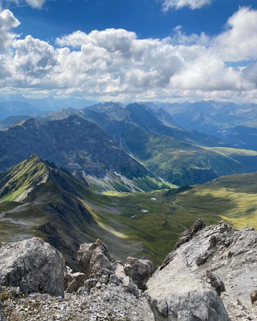 Was mich total geflashed hat, war wirklich die Aussicht von ganz oben. Dir bietet sich ein absolut wunderbares Bündner-Alpen-Panorama vom Silvrettagebiet über Piz Linard zum Piz Kesch, zur Bernina und zum Tinzenhorn, das aussieht wie das Matterhorn.