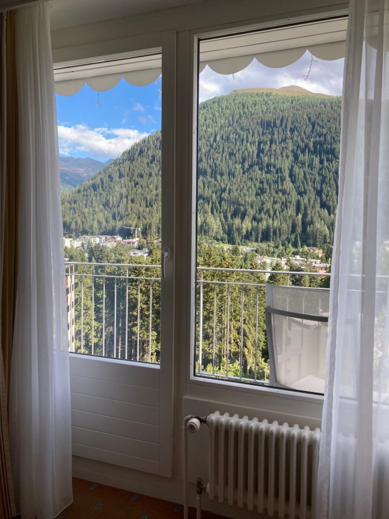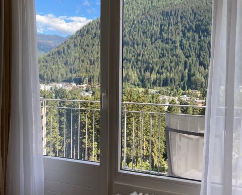 Das Hotel wurde im Jahr 1875 als Grand Hotel Davos eröffnet und verfügt über einen renovierten Wellnessbereich mit einem Pool, einem Whirlpool, Massagen, Fitnesseinrichtungen, Saunen und einem Dampfbad. Das Grandhotel hat seine 5 Sterne in jeder Hinsicht verdient. Sämtliche der 126 Zimmer wurden im Sommer 2013 renoviert, der neu strukturierte Spa- & Wellnessbereich sowie die modernisierte Bar und Lobby und das 2016 renovierte Gourmetrestaurant vereinen nun Tradition und Moderne und lassen den Glanz der „Grande Dame“ neu erstrahlen. Das kann ich in jedem Fall bestätigen: Wir hatten ein sehr schönes und ruhiges Zimmer mit einen traumhaften Ausblick 🙂